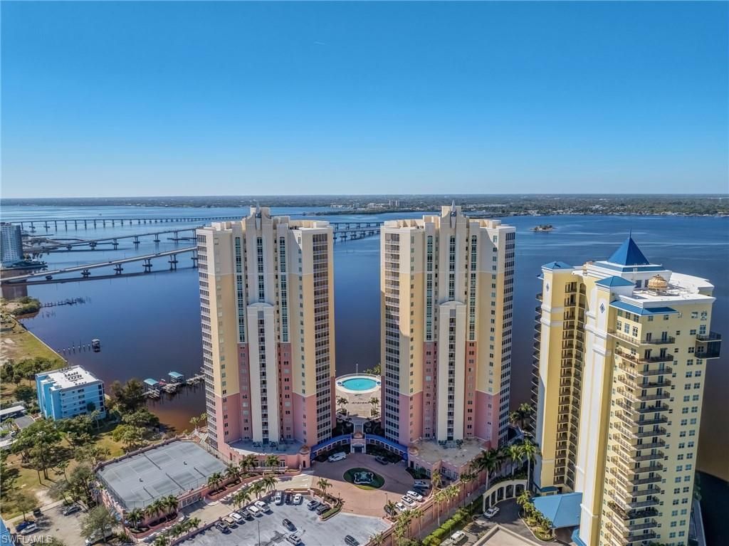 Step off of your private elevator to experience luxury high rise living with unobstructed Sunset views of the Caloosahatchee River from every room. Perched on the 21st floor, this lovely 3/2 turnkey unit boasts open concept living at its finest. The kitchen is appointed with wood cabinetry, stainless steel appliances, granite countertops, and a built-in pantry, opening seamlessly to the dining and living areas. Soaring ceilings throughout with crown molding, tile flooring & carpeting in the bedr...Step off of your private elevator to experience luxury high rise living with unobstructed Sunset views of the Caloosahatchee River from every room. Perched on the 21st floor, this lovely 3/2 turnkey unit boasts open concept living at its finest. The kitchen is appointed with wood cabinetry, stainless steel appliances, granite countertops, and a built-in pantry, opening seamlessly to the dining and living areas. Soaring ceilings throughout with crown molding, tile flooring & carpeting in the bedrooms. The primary suite showcases river views, lanai access, walk in shower, separate soaking tub, dual sinks and a walk-in closet. The 2nd guest bedroom functions as a 2nd primary suite with access to the guest bathroom with dual vanities, walk-in closet and sweeping views of the River and Cape Coral Bridge. Enter through French doors to the 3rd bedroom which also has direct access to the lanai. A whole home water filter & RO system was recently installed along with a brand new HWH. Enjoy a lifestyle of resort style amenities: a riverfront heated pool and spa, fitness center, conference rooms, library, party room, dog park, tennis courts, kayak launch, gas grills, & climate-controlled storage, A lively social committee hosts year-round events, while rotating food trucks bring dining to your doorstep twice a week. The free seasonal trolley makes access to the River District effortless-just minutes away you'll find dining, shopping, live theaters, festivals, art walks, and the weekly farmers' market. This unit is turnkey and has 1 assigned garaged parking space. Whether you are looking for a seasonal getaway, or a full time Riverfront home, this piece of paradise is waiting for you.....You have been formally invited to partake in a lifestyle like no other ...